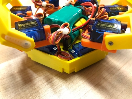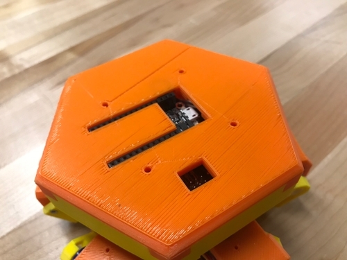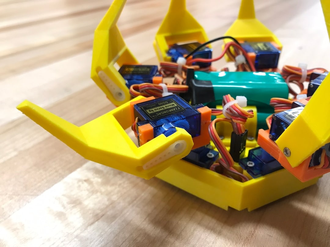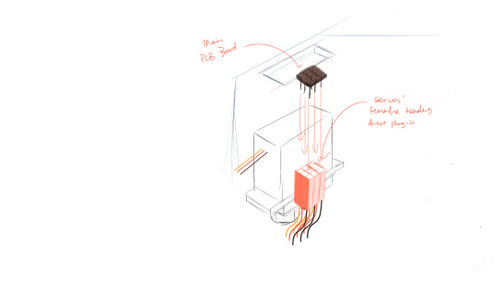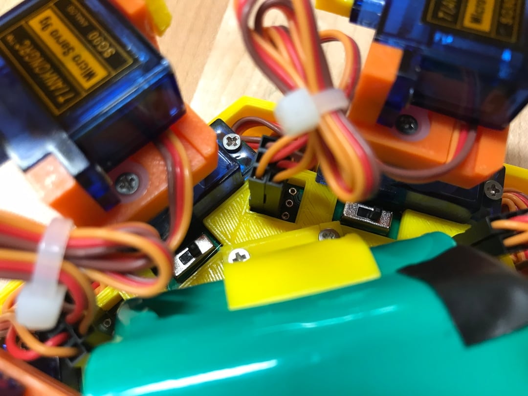 In the new PCB, I re-arranged the servo pins and distributed them downwards at the six corners of the board, so that the servos can be directly attached to the driver board without going into the structure and come out at the top - bringing the wire management system significantly cleaner.