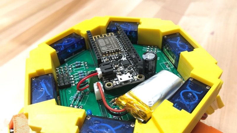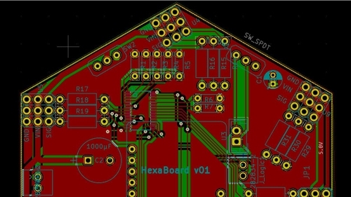 One of the biggest improvents I made on H2 compared to Version H1 is that I designed a hexagon-shape PCB that consists a servo driver (based on Adafruit's PCA9685 driver), power switches, battery ports, and pin headers to connect to the Feather Hazzah.